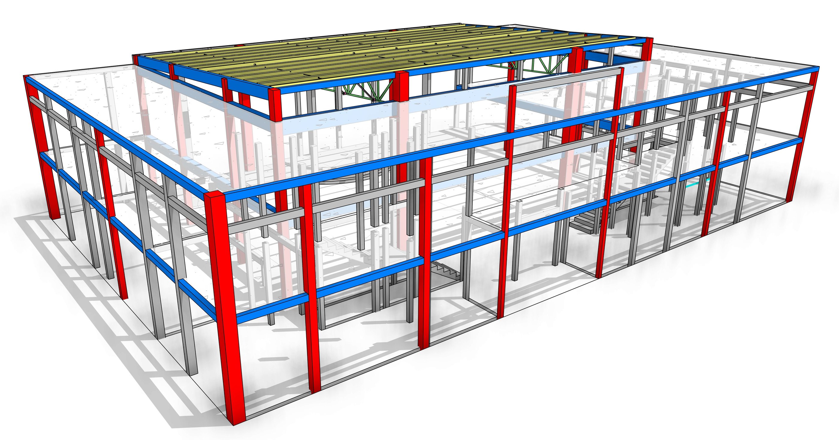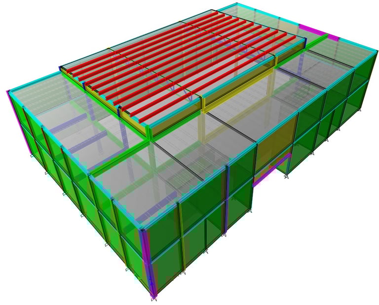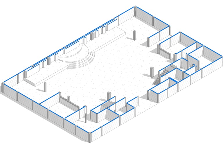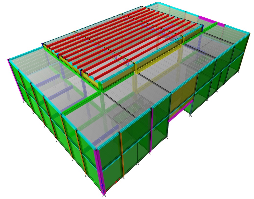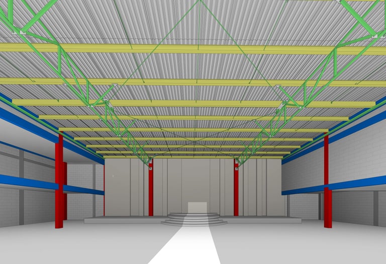 Revisión de estructura existente y diseño de ampliación en edificación a base de estructura de concreto reforzado de 1,000 m², en la zona central del templo se diseño una cubierta ligera apoyada sobre armaduras de acero y polines laminados en frio.